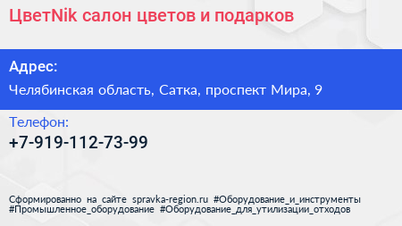 ЦветNik, салон цветов и подарков по адресу Челябинская область, Сатка, проспект Мира, 9 в дальнейшем Организация, размещена в следующих категориях: