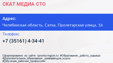 СКАТ-МЕДИА, СТО по адресу Челябинская область, Сатка, Пролетарская улица, 16 в дальнейшем Организация, размещена в следующих категориях: