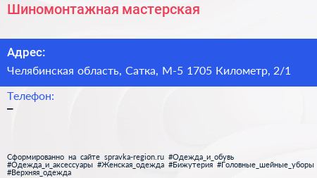 Шиномонтажная мастерская по адресу Челябинская область, Сатка, М-5 1705 Километр, 2/1 в дальнейшем Организация, размещена в следующих категориях: