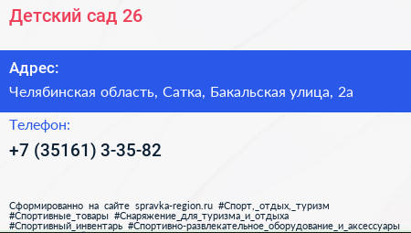 Детский сад №26 по адресу Челябинская область, Сатка, Бакальская улица, 2а в дальнейшем Организация, размещена в следующих категориях: