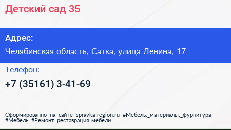 Детский сад №35 по адресу Челябинская область, Сатка, улица Ленина, 17 в дальнейшем Организация, размещена в следующих категориях: