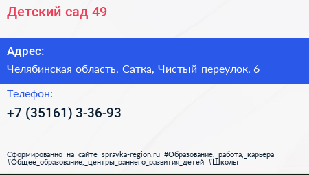 Детский сад №49 по адресу Челябинская область, Сатка, Чистый переулок, 6 в дальнейшем Организация, размещена в следующих категориях: