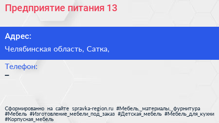 Предприятие питания №13 по адресу Челябинская область, Сатка, в дальнейшем Организация, размещена в следующих категориях: