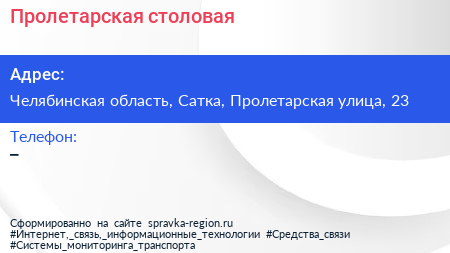 Пролетарская, столовая по адресу Челябинская область, Сатка, Пролетарская улица, 23 в дальнейшем Организация, размещена в следующих категориях: