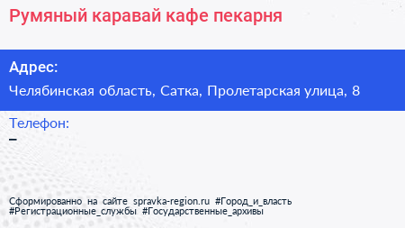 Румяный каравай, кафе-пекарня по адресу Челябинская область, Сатка, Пролетарская улица, 8 в дальнейшем Организация, размещена в следующих категориях: