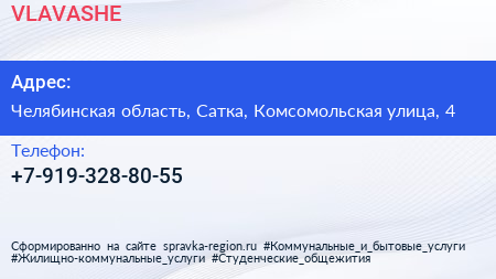 VLAVASHE по адресу Челябинская область, Сатка, Комсомольская улица, 4 в дальнейшем Организация, размещена в следующих категориях: