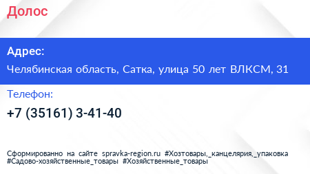 Долос по адресу Челябинская область, Сатка, улица 50 лет ВЛКСМ, 31 в дальнейшем Организация, размещена в следующих категориях: