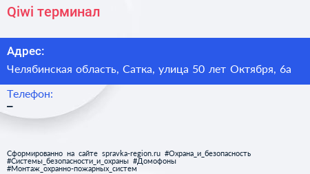 Qiwi, терминал по адресу Челябинская область, Сатка, улица 50 лет Октября, 6а в дальнейшем Организация, размещена в следующих категориях: