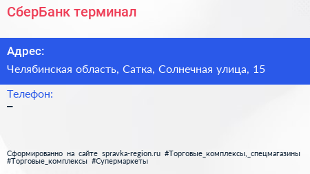 СберБанк, терминал по адресу Челябинская область, Сатка, Солнечная улица, 15 в дальнейшем Организация, размещена в следующих категориях: