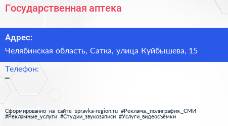 Государственная, аптека по адресу Челябинская область, Сатка, улица Куйбышева, 15 в дальнейшем Организация, размещена в следующих категориях: