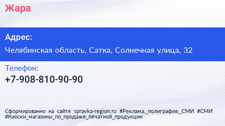 Жара по адресу Челябинская область, Сатка, Солнечная улица, 32 в дальнейшем Организация, размещена в следующих категориях: