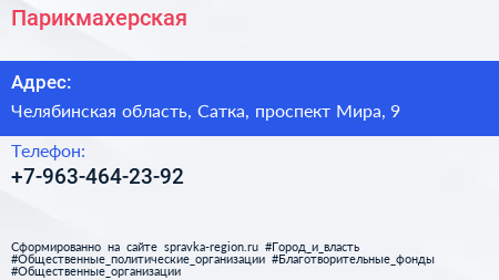 Парикмахерская по адресу Челябинская область, Сатка, проспект Мира, 9 в дальнейшем Организация, размещена в следующих категориях: