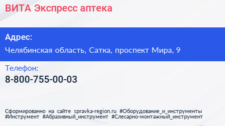 ВИТА Экспресс, аптека по адресу Челябинская область, Сатка, проспект Мира, 9 в дальнейшем Организация, размещена в следующих категориях: