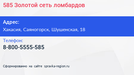 585*Золотой, сеть ломбардов по адресу Хакасия, Саяногорск, Шушенская, 18 в дальнейшем Организация, размещена в следующих категориях: