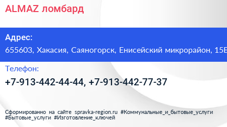 ALMAZ, ломбард по адресу 655603, Хакасия, Саяногорск, Енисейский микрорайон, 15Б в дальнейшем Организация, размещена в следующих категориях: