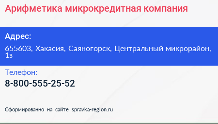 Арифметика, микрокредитная компания по адресу 655603, Хакасия, Саяногорск, Центральный микрорайон, 1з в дальнейшем Организация, размещена в следующих категориях:
