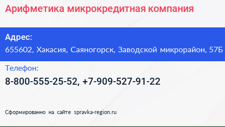 Арифметика, микрокредитная компания по адресу 655602, Хакасия, Саяногорск, Заводской микрорайон, 57Б в дальнейшем Организация, размещена в следующих категориях: