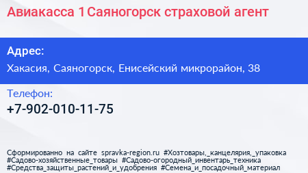 Авиакасса №1 Саяногорск, cтраховой агент по адресу Хакасия, Саяногорск, Енисейский микрорайон, 38 в дальнейшем Организация, размещена в следующих категориях: