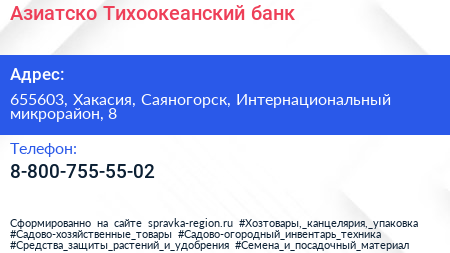 Азиатско-Тихоокеанский банк по адресу 655603, Хакасия, Саяногорск, Интернациональный микрорайон, 8 в дальнейшем Организация, размещена в следующих категориях: