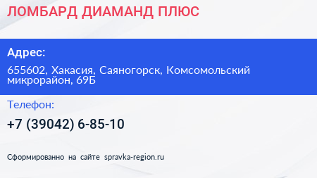 ЛОМБАРД ДИАМАНД ПЛЮС по адресу 655602, Хакасия, Саяногорск, Комсомольский микрорайон, 69Б в дальнейшем Организация, размещена в следующих категориях: