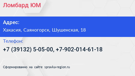 Ломбард ЮМ по адресу Хакасия, Саяногорск, Шушенская, 18 в дальнейшем Организация, размещена в следующих категориях: