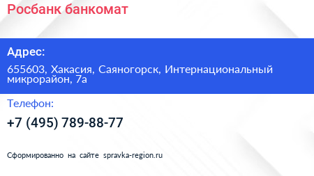Росбанк, банкомат по адресу 655603, Хакасия, Саяногорск, Интернациональный микрорайон, 7а в дальнейшем Организация, размещена в следующих категориях: