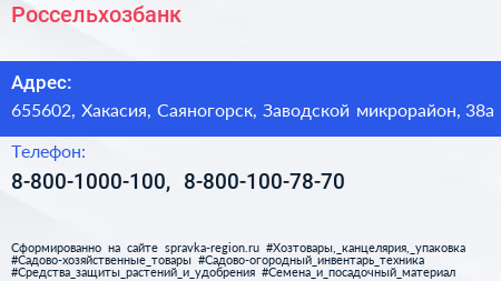 Россельхозбанк по адресу 655602, Хакасия, Саяногорск, Заводской микрорайон, 38а в дальнейшем Организация, размещена в следующих категориях: