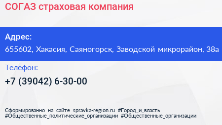СОГАЗ, страховая компания по адресу 655602, Хакасия, Саяногорск, Заводской микрорайон, 38а в дальнейшем Организация, размещена в следующих категориях: