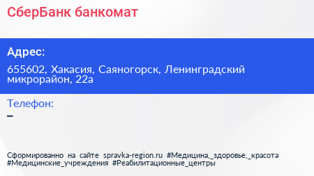 СберБанк, банкомат по адресу 655602, Хакасия, Саяногорск, Ленинградский микрорайон, 22а в дальнейшем Организация, размещена в следующих категориях: