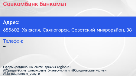 Совкомбанк, банкомат по адресу 655602, Хакасия, Саяногорск, Советский микрорайон, 38 в дальнейшем Организация, размещена в следующих категориях: