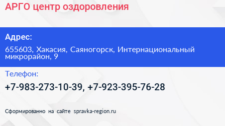 АРГО, центр оздоровления по адресу 655603, Хакасия, Саяногорск, Интернациональный микрорайон, 9 в дальнейшем Организация, размещена в следующих категориях: