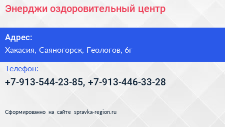 Энерджи, оздоровительный центр по адресу Хакасия, Саяногорск, Геологов, 6г в дальнейшем Организация, размещена в следующих категориях: