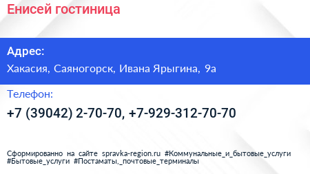 Енисей, гостиница по адресу Хакасия, Саяногорск, Ивана Ярыгина, 9а в дальнейшем Организация, размещена в следующих категориях: