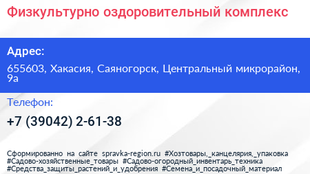 Физкультурно-оздоровительный комплекс по адресу 655603, Хакасия, Саяногорск, Центральный микрорайон, 9а в дальнейшем Организация, размещена в следующих категориях: