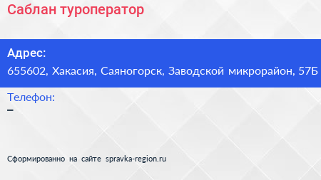 Саблан, туроператор по адресу 655602, Хакасия, Саяногорск, Заводской микрорайон, 57Б в дальнейшем Организация, размещена в следующих категориях: