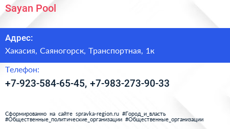 Sayan Pool по адресу Хакасия, Саяногорск, Транспортная, 1к в дальнейшем Организация, размещена в следующих категориях:
