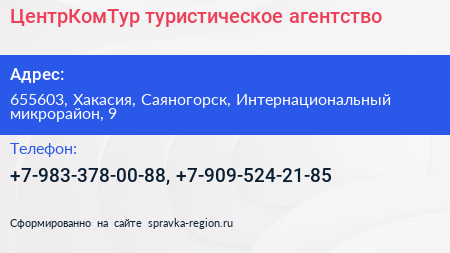 ЦентрКомТур, туристическое агентство по адресу 655603, Хакасия, Саяногорск, Интернациональный микрорайон, 9 в дальнейшем Организация, размещена в следующих категориях: