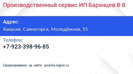 Производственный сервис, ИП Баранцев В.В. по адресу Хакасия, Саяногорск, Молодёжная, 15 в дальнейшем Организация, размещена в следующих категориях:
