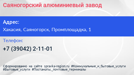 Саяногорский алюминиевый завод по адресу Хакасия, Саяногорск, Промплощадка, 1 в дальнейшем Организация, размещена в следующих категориях: