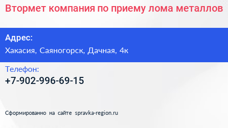 Втормет, компания по приему лома металлов по адресу Хакасия, Саяногорск, Дачная, 4к в дальнейшем Организация, размещена в следующих категориях: