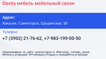 Davita-мебель, мебельный салон по адресу Хакасия, Саяногорск, Шушенская, 18 в дальнейшем Организация, размещена в следующих категориях: