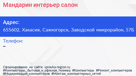 Мандарин, интерьер-салон по адресу 655602, Хакасия, Саяногорск, Заводской микрорайон, 57Б в дальнейшем Организация, размещена в следующих категориях: