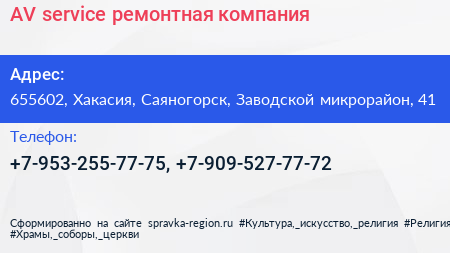 AV service, ремонтная компания по адресу 655602, Хакасия, Саяногорск, Заводской микрорайон, 41 в дальнейшем Организация, размещена в следующих категориях: