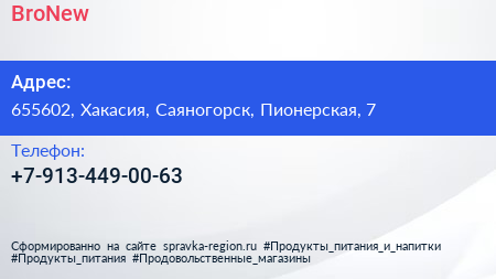 BroNew по адресу 655602, Хакасия, Саяногорск, Пионерская, 7 в дальнейшем Организация, размещена в следующих категориях: