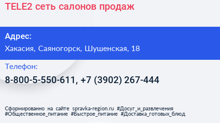 TELE2, сеть салонов продаж по адресу Хакасия, Саяногорск, Шушенская, 18 в дальнейшем Организация, размещена в следующих категориях: