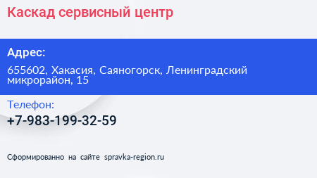 Каскад, сервисный центр по адресу 655602, Хакасия, Саяногорск, Ленинградский микрорайон, 15 в дальнейшем Организация, размещена в следующих категориях: