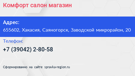 Комфорт, салон-магазин по адресу 655602, Хакасия, Саяногорск, Заводской микрорайон, 20 в дальнейшем Организация, размещена в следующих категориях: