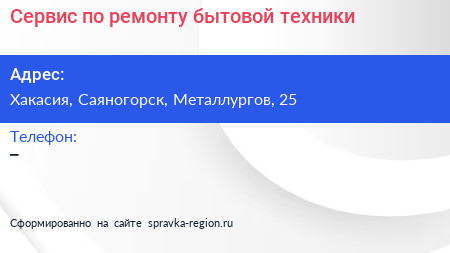 Сервис по ремонту бытовой техники по адресу Хакасия, Саяногорск, Металлургов, 25 в дальнейшем Организация, размещена в следующих категориях: