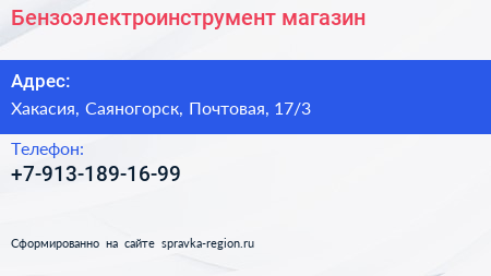 Бензоэлектроинструмент, магазин по адресу Хакасия, Саяногорск, Почтовая, 17/3 в дальнейшем Организация, размещена в следующих категориях:
