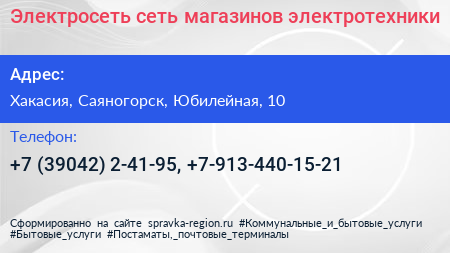 Электросеть, сеть магазинов электротехники по адресу Хакасия, Саяногорск, Юбилейная, 10 в дальнейшем Организация, размещена в следующих категориях: